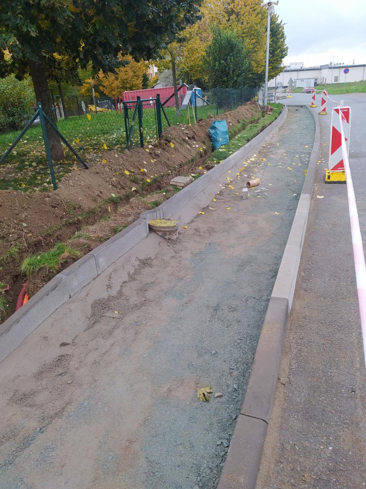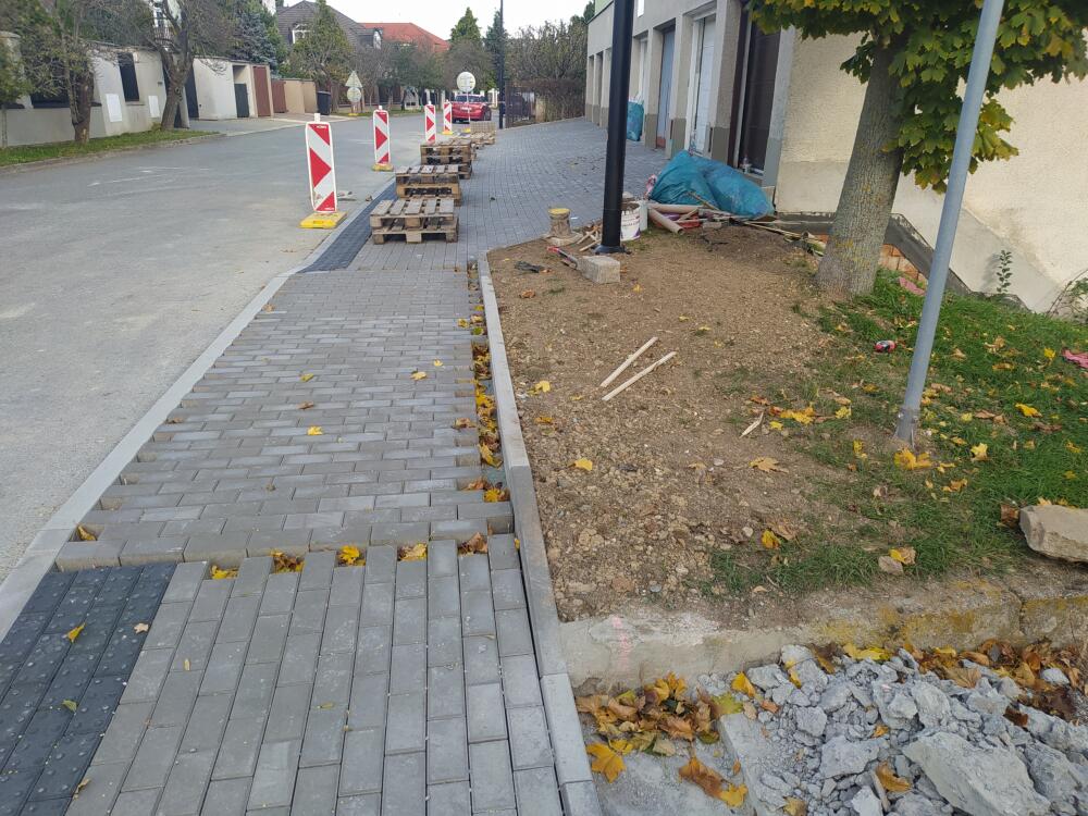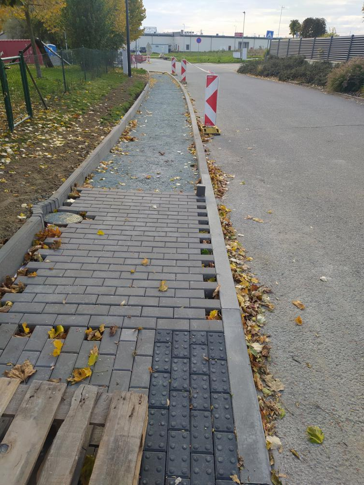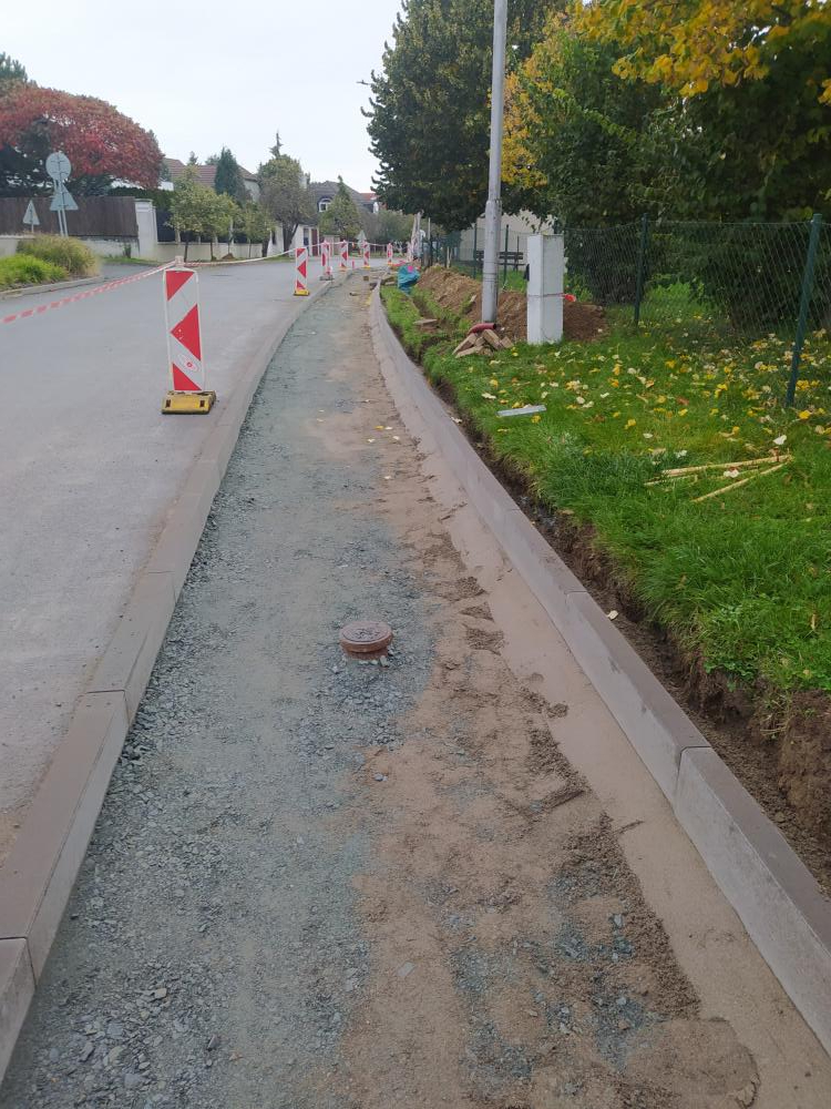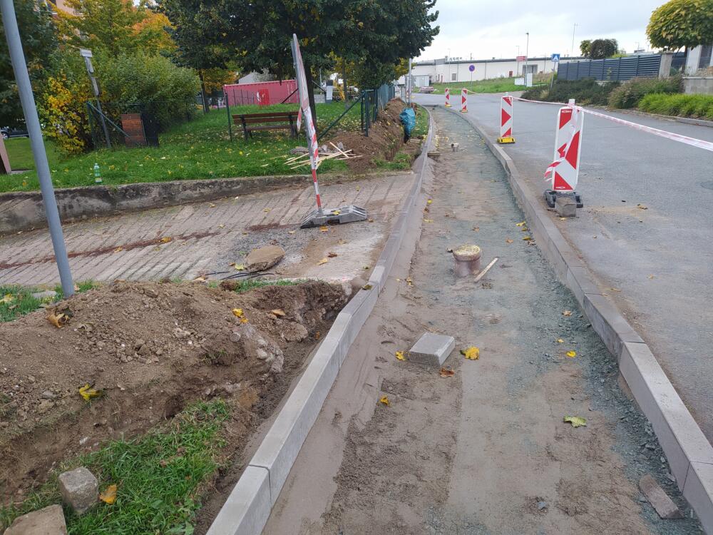 Výkop staré skladby chodníku, obrubníků, odvoz a likvidace výkopku a suti, vybudování podkladních i nášlapných vrstev chodníku a nového obrubníku (osazují se nově chodníkové, nájezdové a přechodové obrubníky, silniční obrubníky budou vyměněny pouze v místech poškození). V místě vjezdů bude provedení úpravy chodníku pro zrakově postižené (šíře pásu 40 cm v barvě šedé – antracit). Dále bude provedena úprava okolního terénu zasažená pracemi souvisejícími s rekonstrukcí.